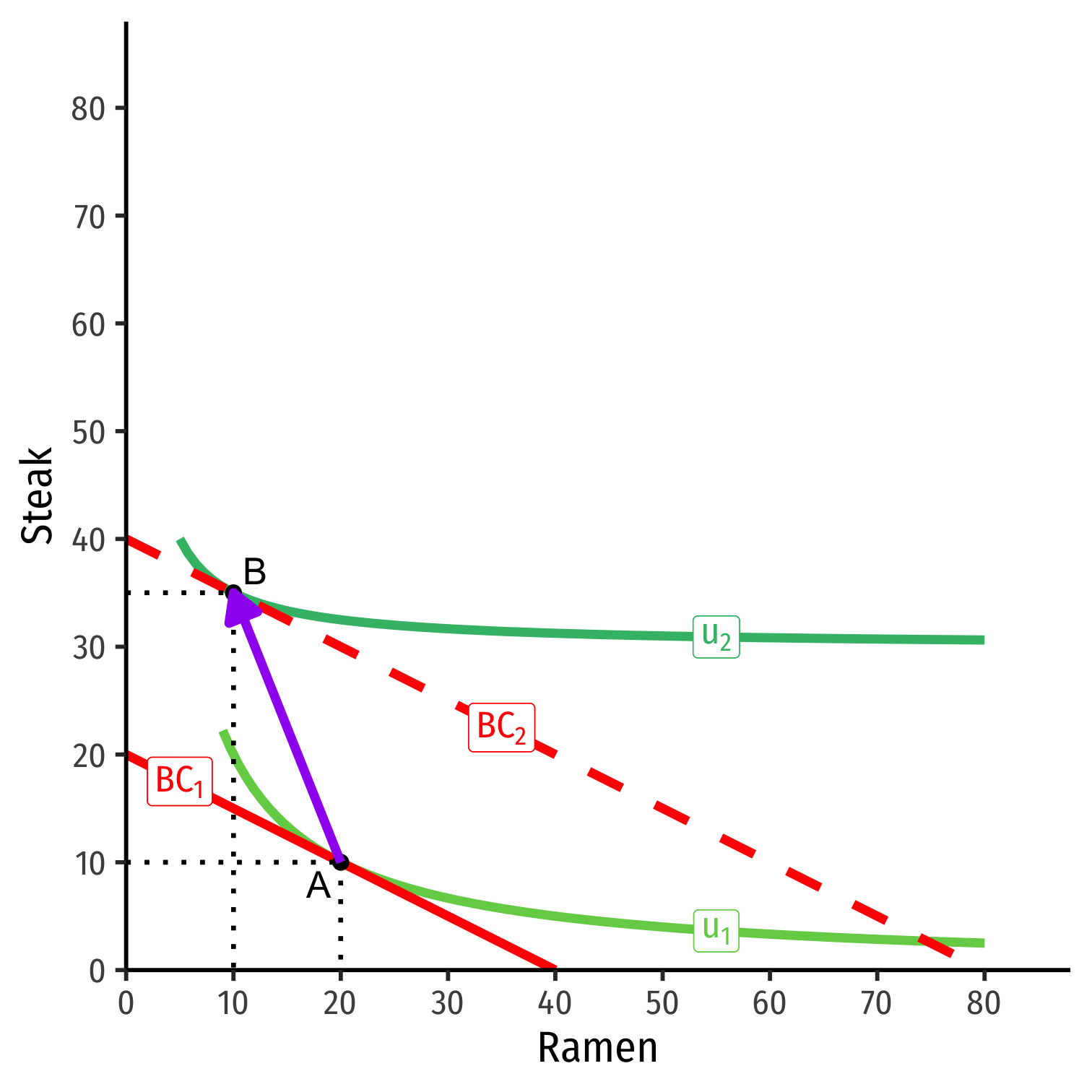 At new optimum (B), consumes more steak, less ramen