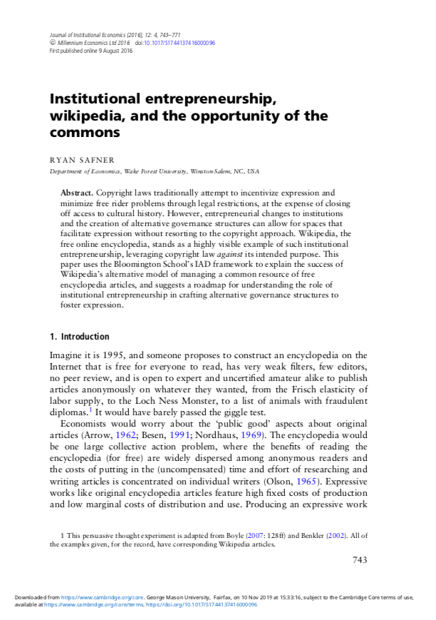 Safner, Ryan, 2016, “Institutional Entrepreneurship, Wikipedia, and the Opportunity of the Commons,” Journal of Institutional Economics 12(4): 743-771