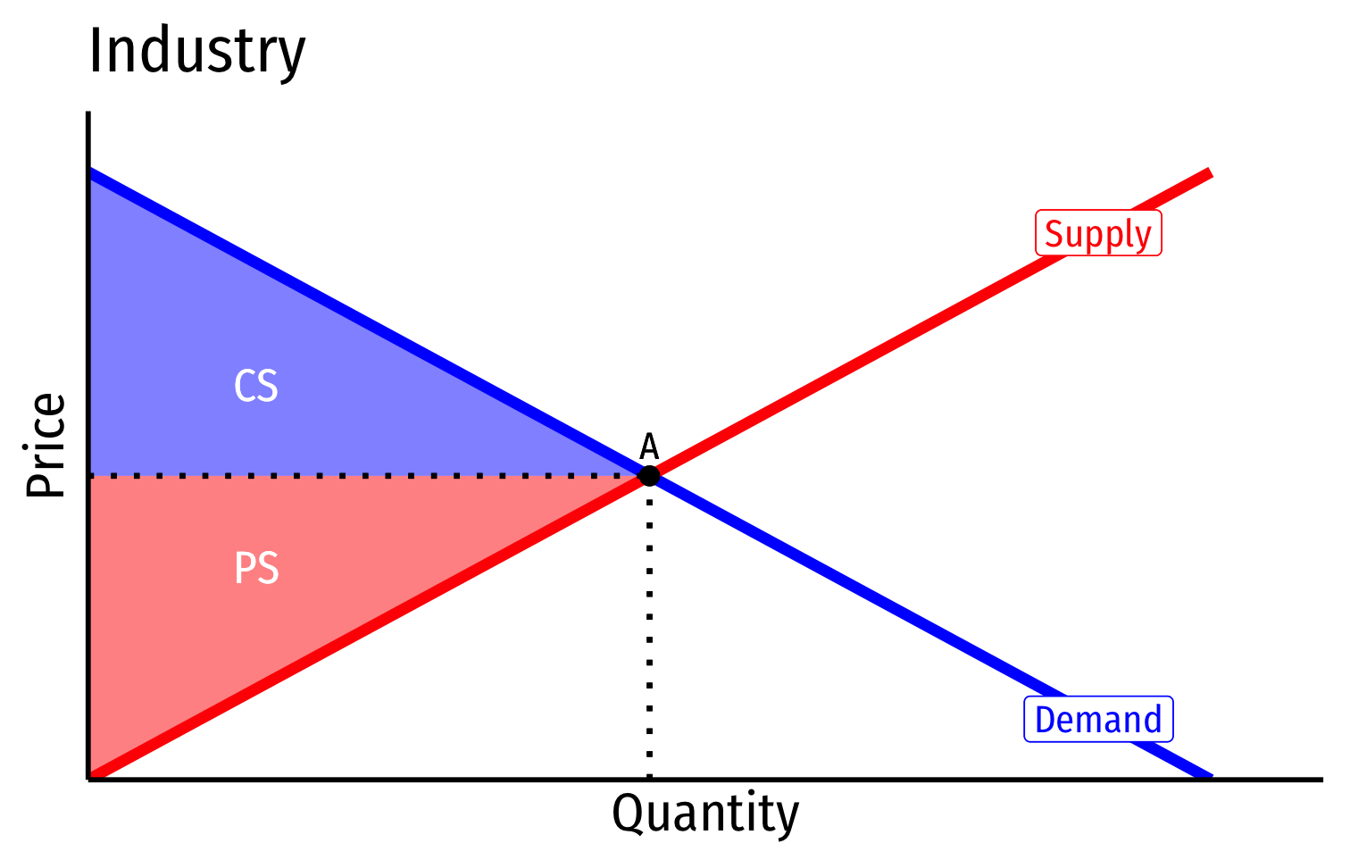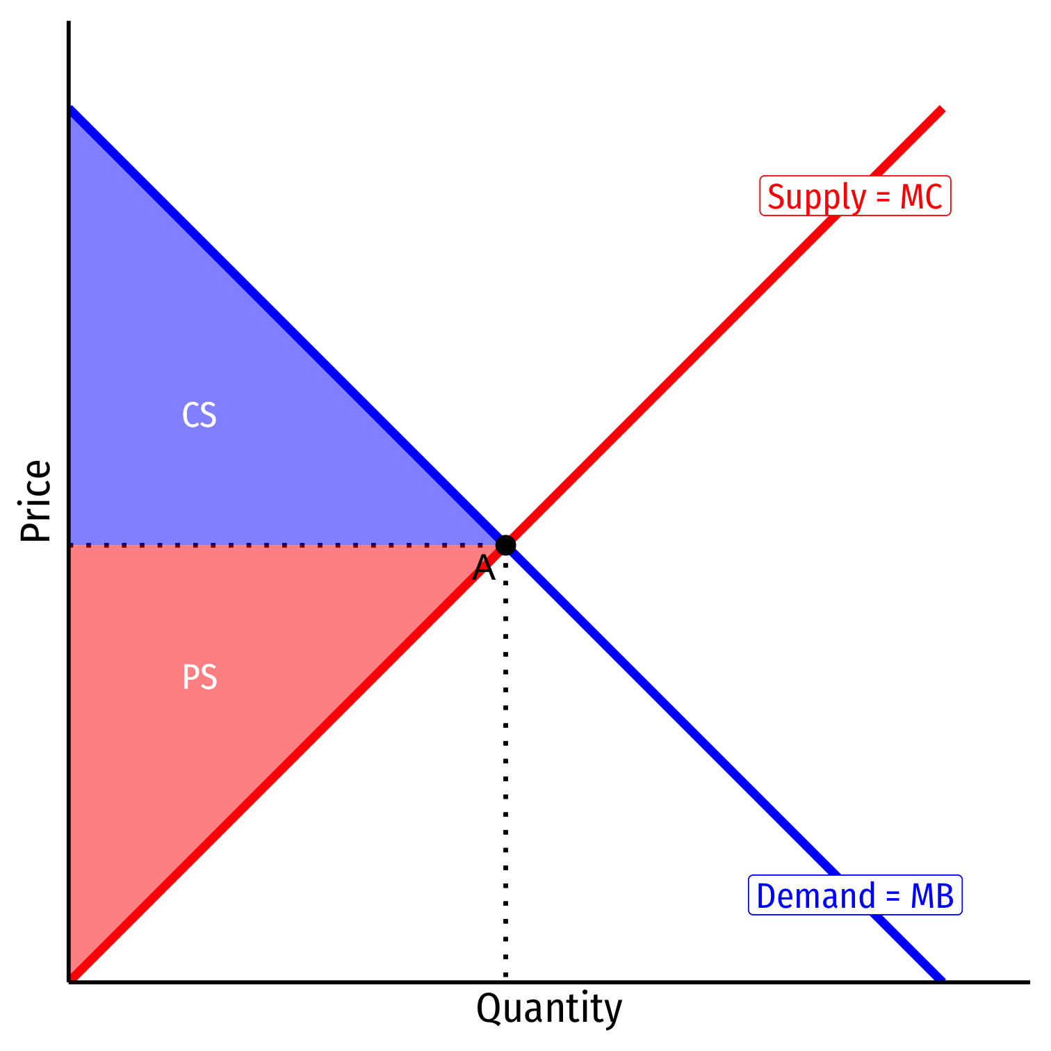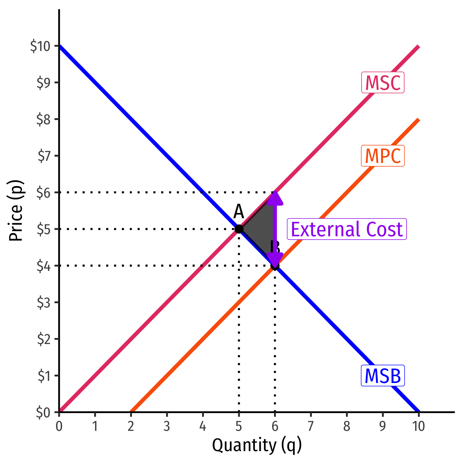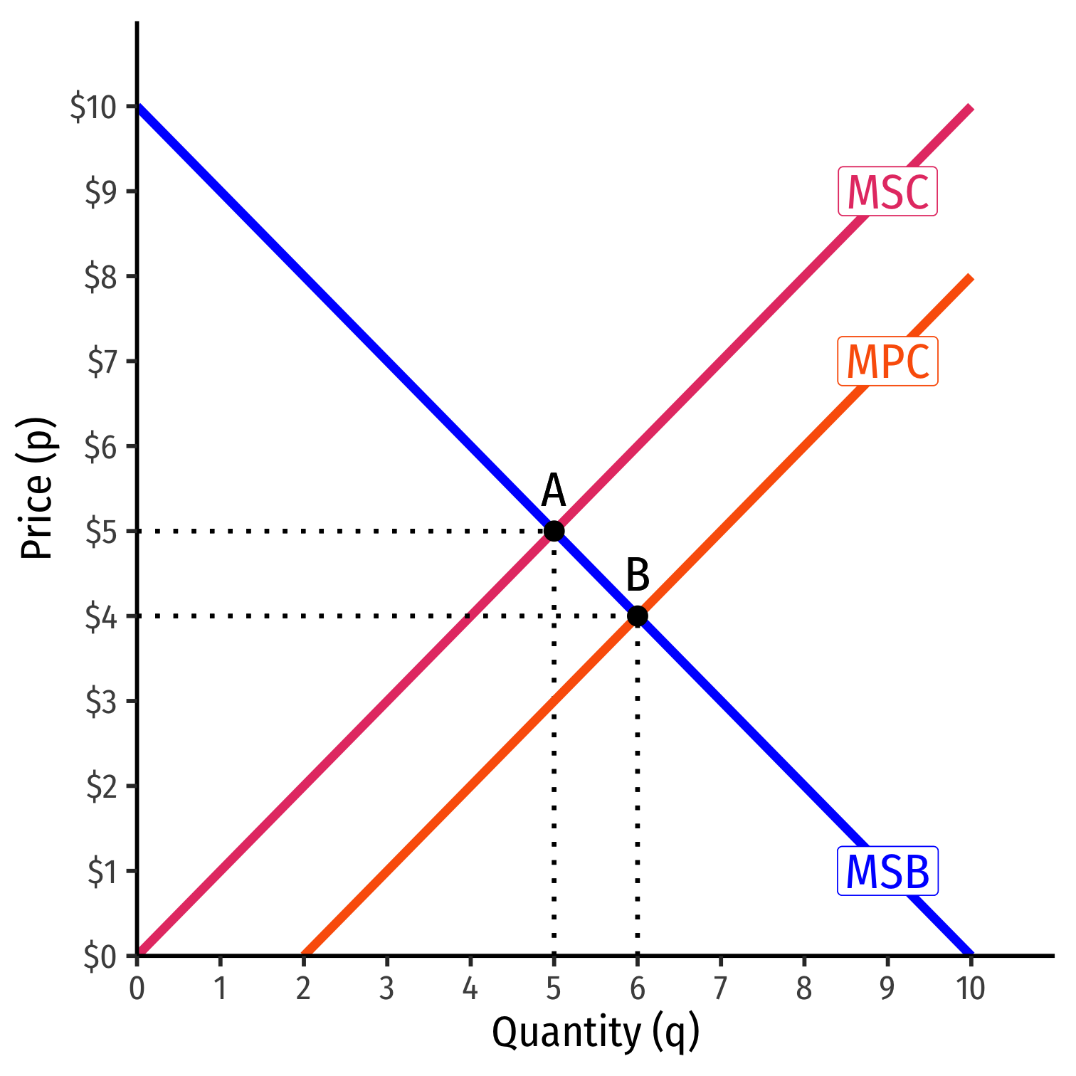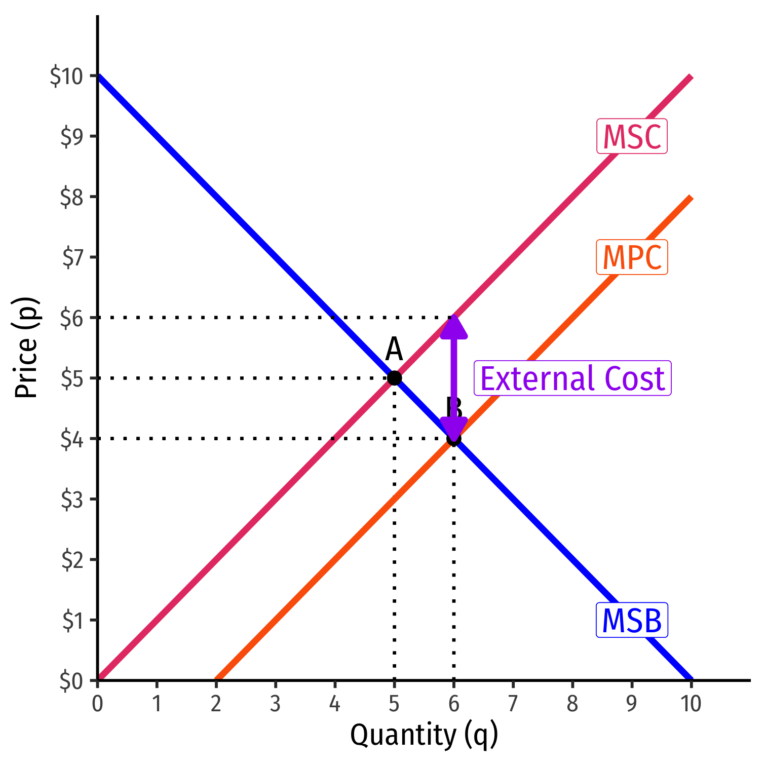 Market Equilibrium (B) too much q at too low p compared to Social Optimum (A)